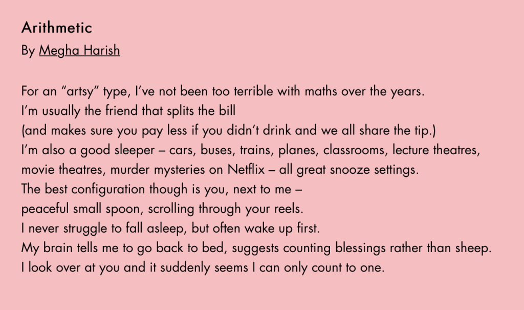 As an alumnus of the Barbican Young Poets programme, Megha was paired with poet Rishi Dastidar to collaborate on a piece around the theme “human.kind” which would then be illustrated by a visual artist from The Lettering Arts Trust. Rishi and Megha produced a specular poem called, “What Does Day 2 Look Like?” inspired by their political conversations around various elections taking place in 2024.