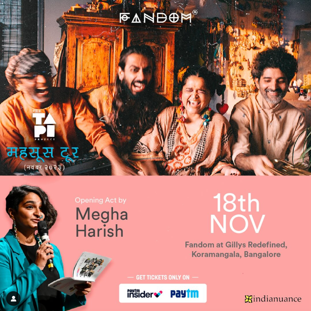 Megha was commissioned to write a poem to accompany the launch of The Tapi Project’s new track, Mehsoos, in 2023. They performed it alongside the band at Gilly’s Fandom in Bangalore.